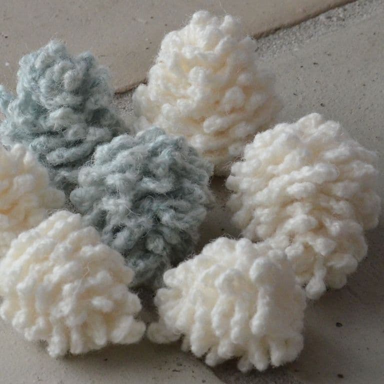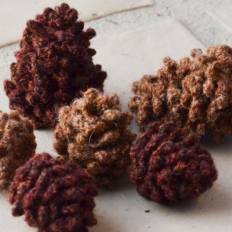 Cones are the forests own beautiful Christmas decorations. These small knitted cones are a great addition to decorations for the Christmas tree or for a branch found in the woods.