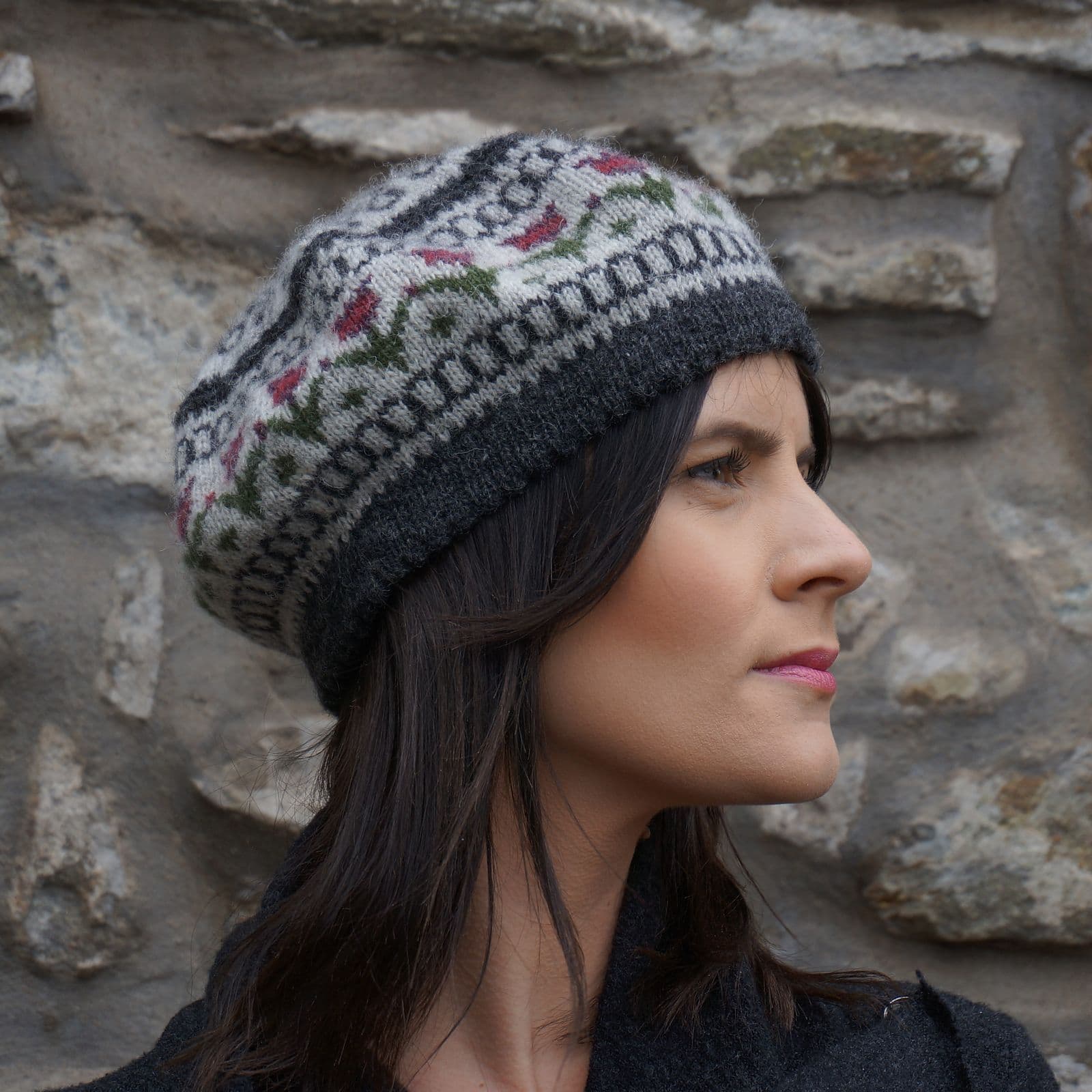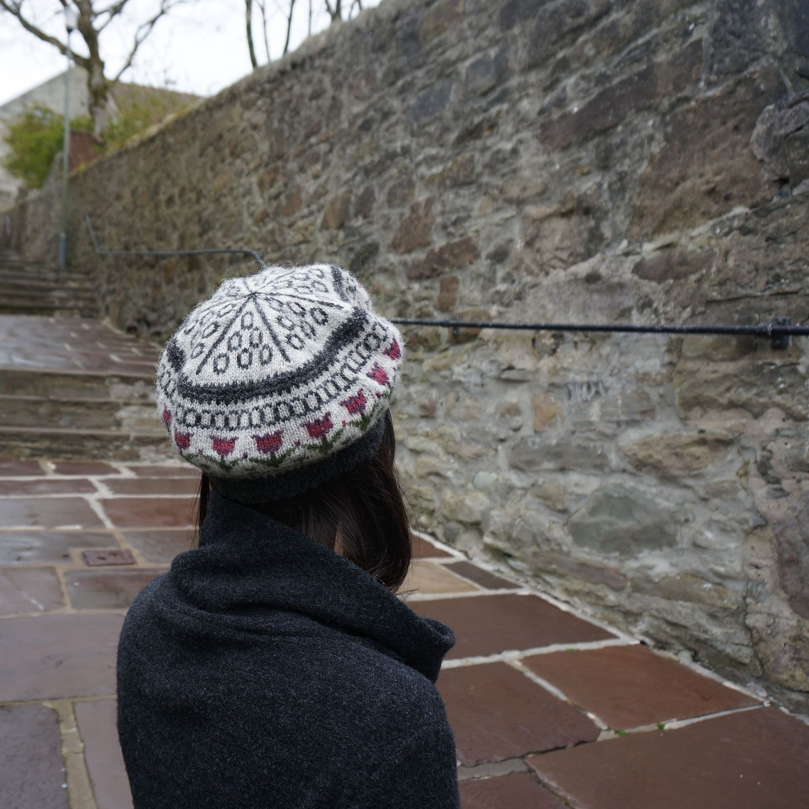 The Papil Beret uses the same motifs as the Papil Mitts; those were inspired by a tin containing caramel wafers that was given to me by two Dutch friends during Shetland Wool Week 2016. We met up during a workshop I was teaching at a venue in Papil, Burra Isle and they were also staying in a cottage nearby. Using Shetland knitting techniques together with the pattern inspired by the tin from the Netherlands this design celebrates the links we have with knitters all over the world and the amazing community of craftspeople we belong to. As someone once said to me we are all joined together with yarn and thread.